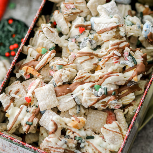Years ago, we had a neighbor who dropped off a tin of white chocolate Chex mix. It wasn’t anything fancy, just this simple little mix with a few yummy ingredients. But when I popped that into my mouth, holy cow, I could not stop eating it! I decided right then and there, I had to make my own recipe for this. I’ve added a few festive ingredients and made it my own. My kids love helping me make this delicious white chocolate Chex mix every year.