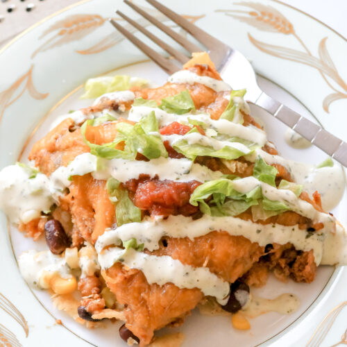 - Add in enchilada sauce, black beans, and corn and simmer for 3-5 minutes to let flavors blend. Remove from heat and set aside.