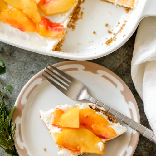 This no-bake gluten-free peach pie is the perfect easy summer dessert, made with sweet, juicy peaches and a gluten free graham cracker crust. It’s refreshingly simple, incredibly delicious, and comes together without ever turning on the oven.