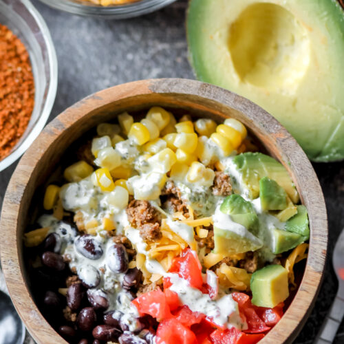 - Cilantro Ranch – If you are going to make these burrito bowls, I’m just going to say, don’t skip out on the cilantro ranch dressing. Holy cow it’s good. It’s super easy to make, you just throw all the ingredients in the blender and it’s good to go. Get my recipe for cilantro ranch dressing here.