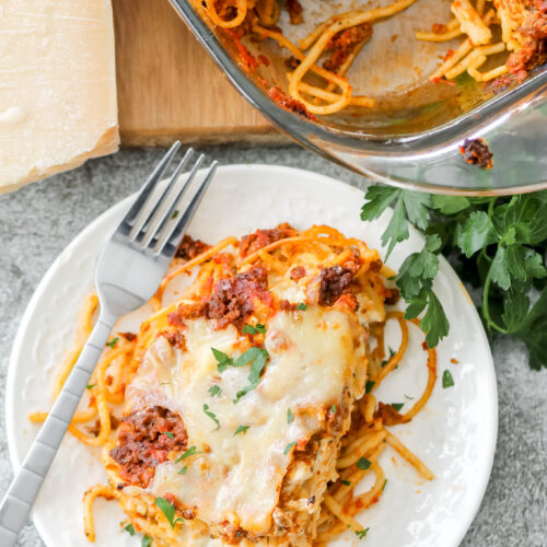 - Cottage Cheese – Traditional million-dollar spaghetti has ricotta cheese, but we aren’t fans of it at our house, so I like to use cottage cheese. It has a better flavor and also increases the protein in the meal.