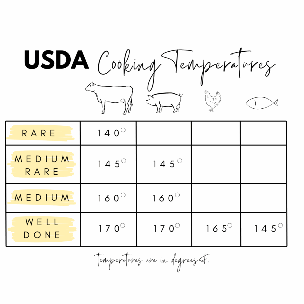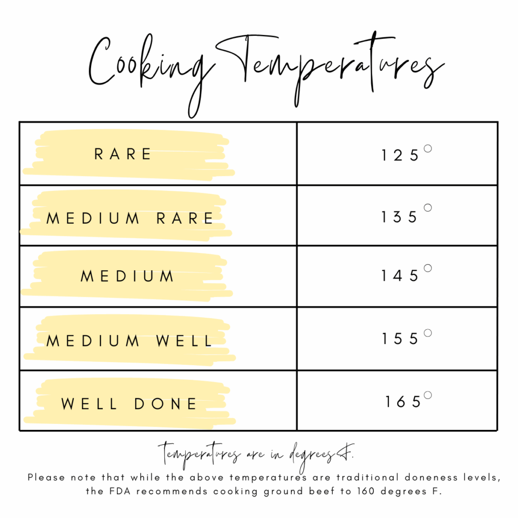 - Cook until burgers reach desired temperature (see below for cooking temperatures) then remove from heat.
