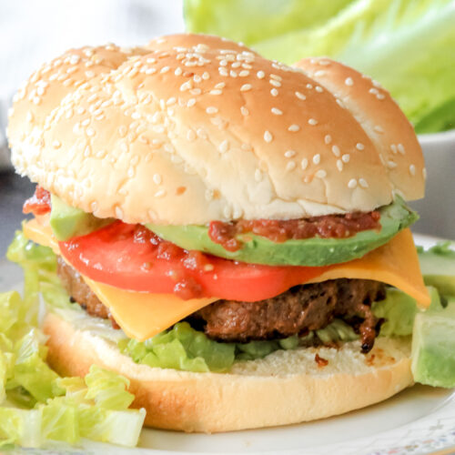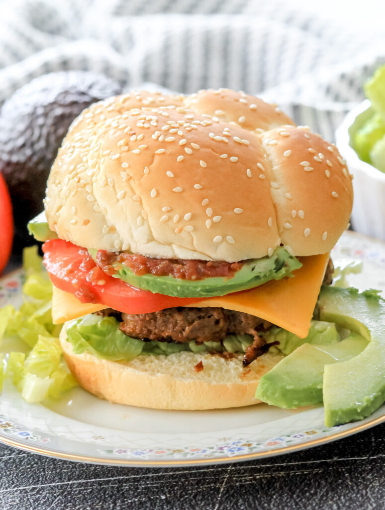 If you haven’t tried a taco burger before, let me be the first to say, you should! Taco burgers are a quick and easy dinner that fills you up! These taco burgers have a delightful kick from the taco seasoning and are then topped with some salsa, guacamole, and lettuce for the ultimate burger!