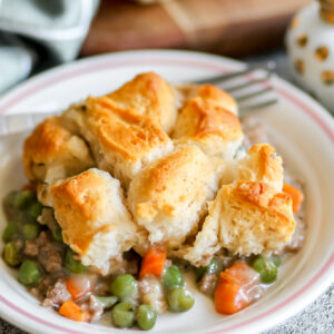 Keyword beef casserole, beef pot pie bake, biscuit pot pie, comfort food dinner, easy pot pie recipe, easy weeknight dinners, family-friendly meal, ground beef pot pie, pot pie with biscuits, savory beef bake