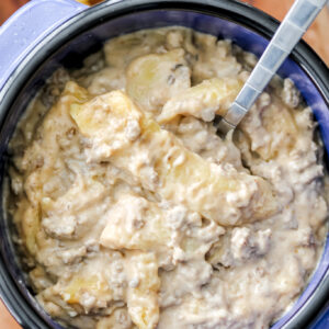 Once the beef is fully cooked, stir in the beef broth, cream of mushroom soup, milk, and brown gravy mix. Reduce the heat to low and let it simmer for about 10 minutes to blend the flavors.