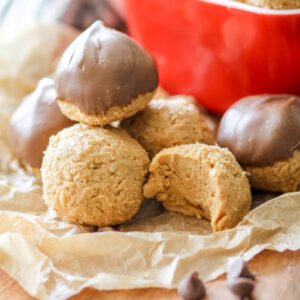 Using a cookie scoop, scoop out desired sized peanut butter balls and place them on the baking sheet lined with a silicone baking mat or parchment paper.