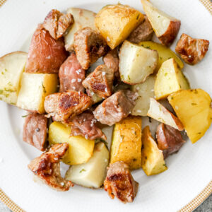 Once the potatoes are tender and starting to crisp, remove the pan from the oven and evenly layer the steak over the top. Return to the oven and bake for 7–10 minutes, or until the steak reaches your desired doneness.