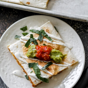 Layer the tortillas on the baking sheet. Place 2-3 tortillas in the center of the baking sheet and the other tortillas so that half the tortilla hangs over the edge of the baking sheet.